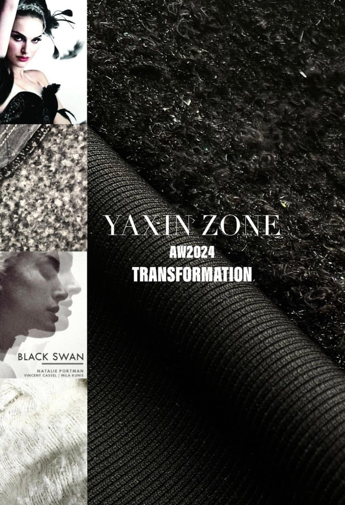 白一色から黒一色に移行するシリーズとは別に、翼を象徴するボリュームのある袖の形は、徐々にデザインが大きくなり、最終的には黒鳥の変身した翼へと展開する。ダイナミックな質感を表現するため、「TRANSFORMATION」シリーズの8着は、ツイードを主な素材とし、ツイード、スエデット、デニムを組み合わせたYAXIN ZONEの特徴的な並置技法を用いている。地元の繊維産業をサポートする証として、TRANSFORMATIONシリーズにはすべて台湾製の生地が使用されている。